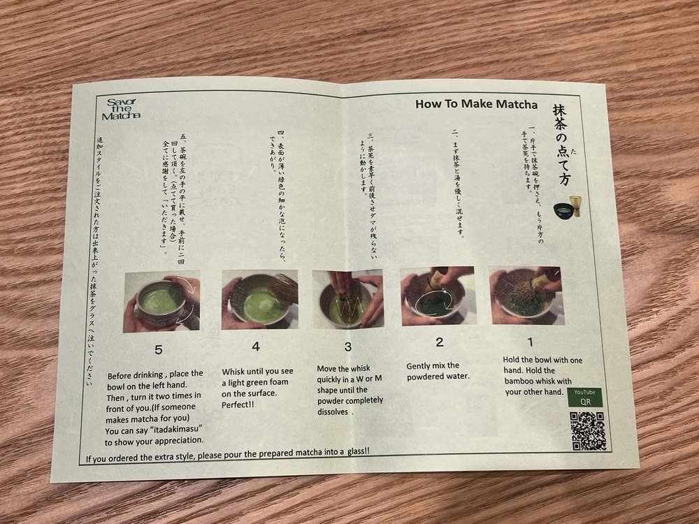 抹茶を点てる前に、点て方が書かれた説明用紙が渡されます。また、抹茶を点てるタイミングでは店員さんが説明してくださるため、初めての方でも安心です。