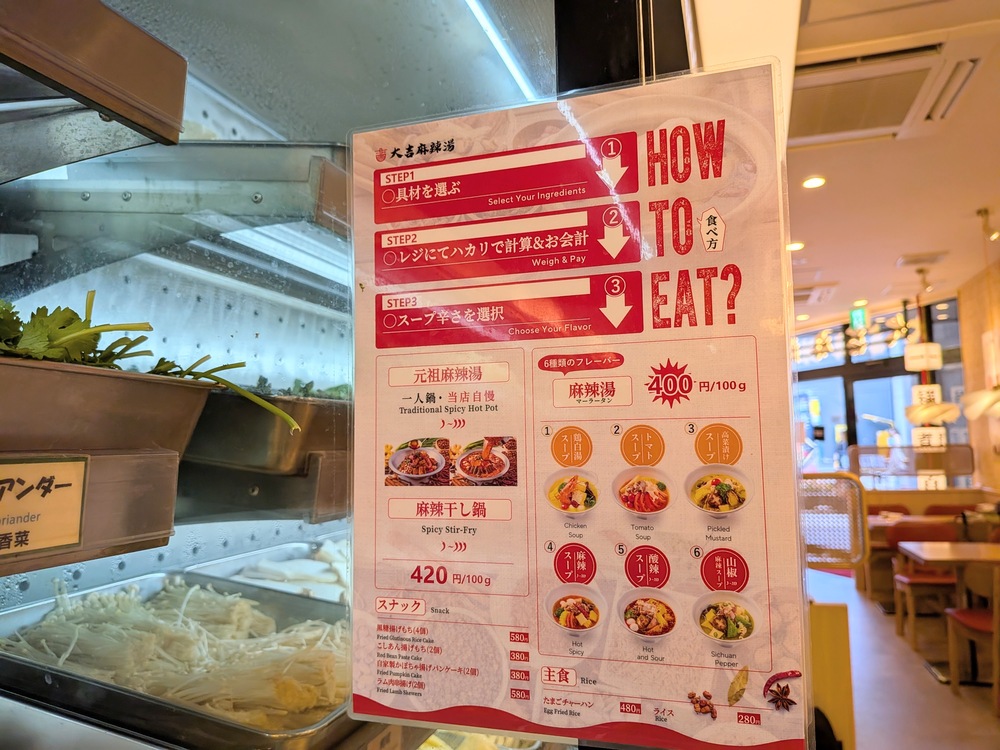 オーダーの方法は、まず食材を選び、レジで計量してから、スープを選択します。