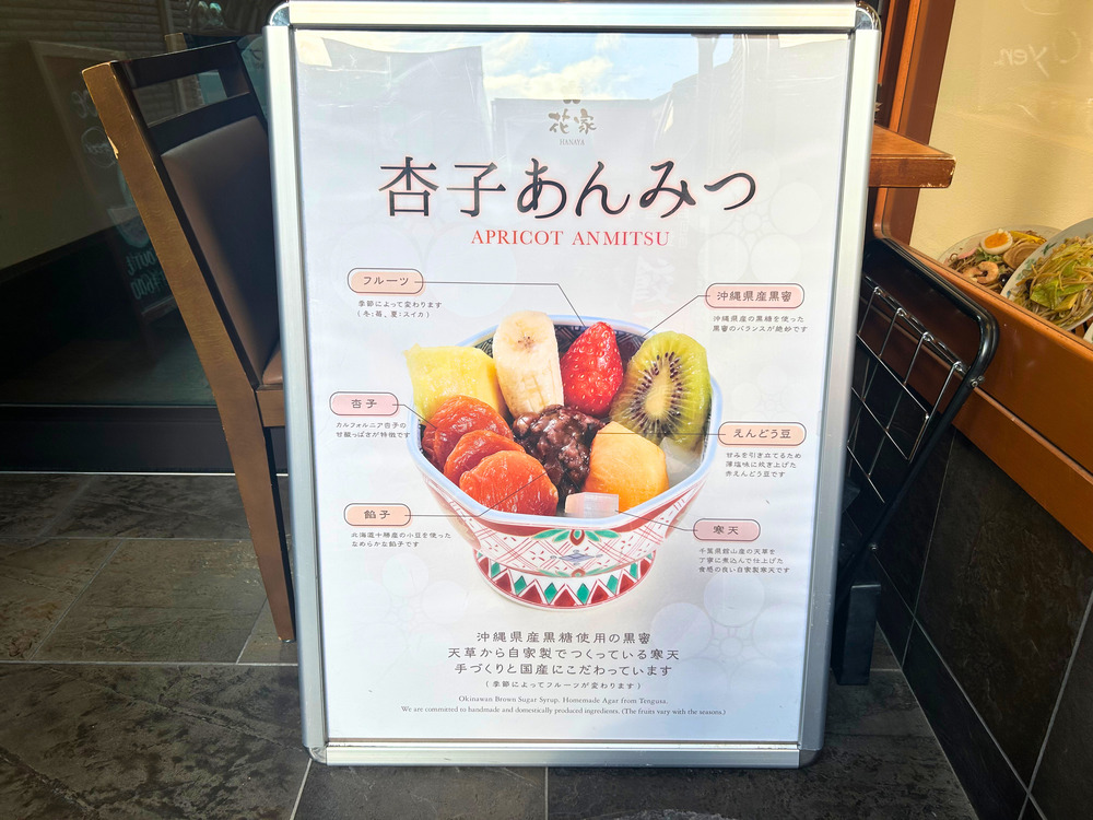 店外の掲示によると、沖縄県産黒糖を使用した黒蜜や、天草から自然製法でつくられている寒天を使うなど、手づくりと国産にこだわっているそうです。