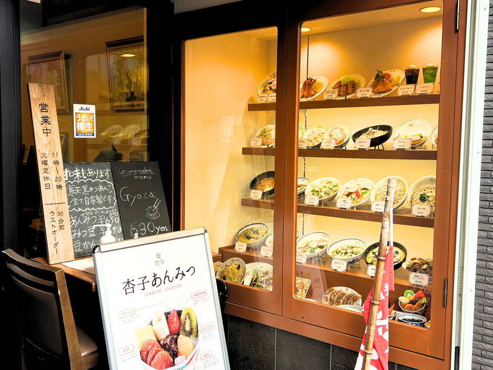 店頭には看板や料理のサンプルが並び、ラーメンや定食、甘味まで、どのようなメニューがあるのかを入店前に確認できます。