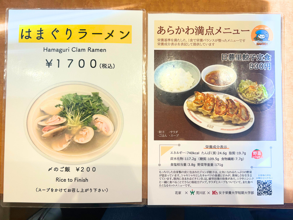 さらに、荒川区が推進する栄養基準を満たした「あらかわ満点メニュー」に認定された餃子定食もありました。