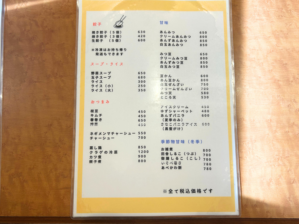 花家のメニューは、ラーメンや焼きそばなどの麺類、定食などのご飯もの、餃子といった一品料理に加え、あんみつやところ天などの甘味まで幅広くそろっています。