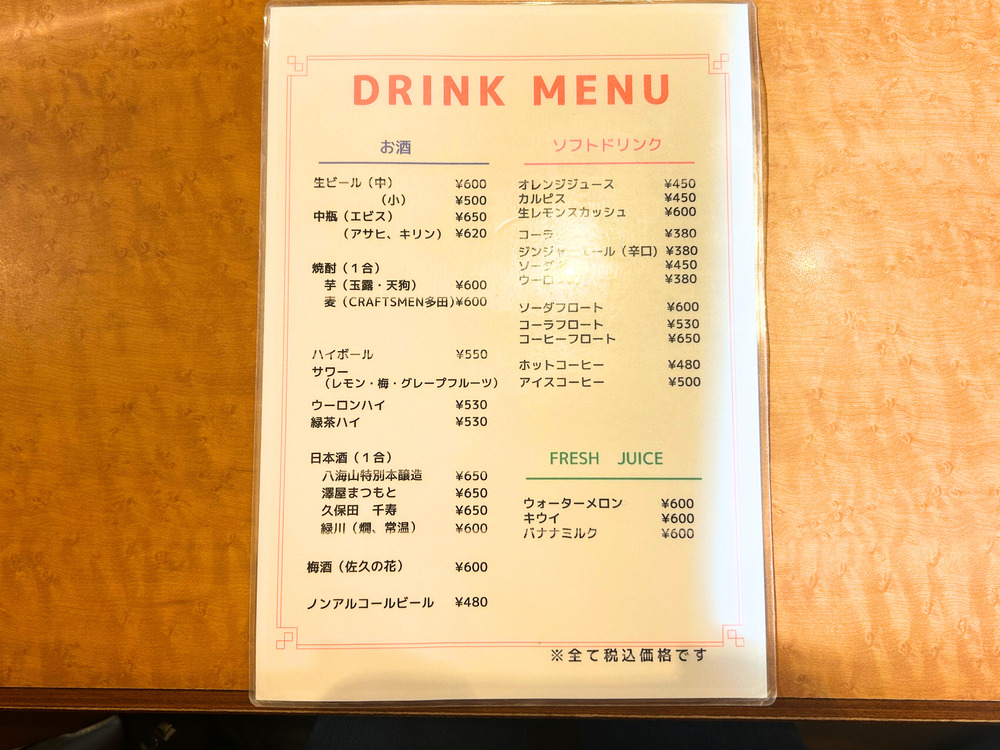 ビール、焼酎、日本酒といったアルコール類のほか、オレンジジュースやカルピスなどのソフトドリンク、ソーダフロートやコーラフロートもそろっており、家族連れでも安心のラインアップです。