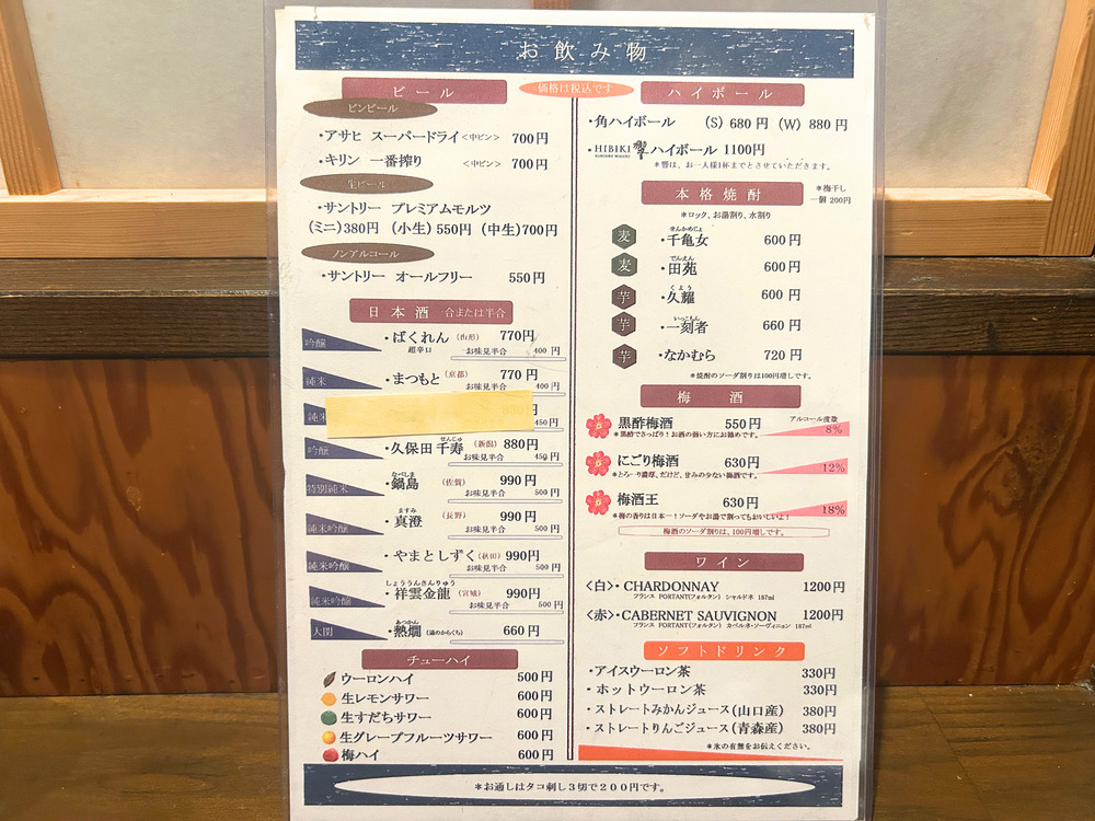 ビール、日本酒、焼酎、ワインとアルコールも各種揃っています。