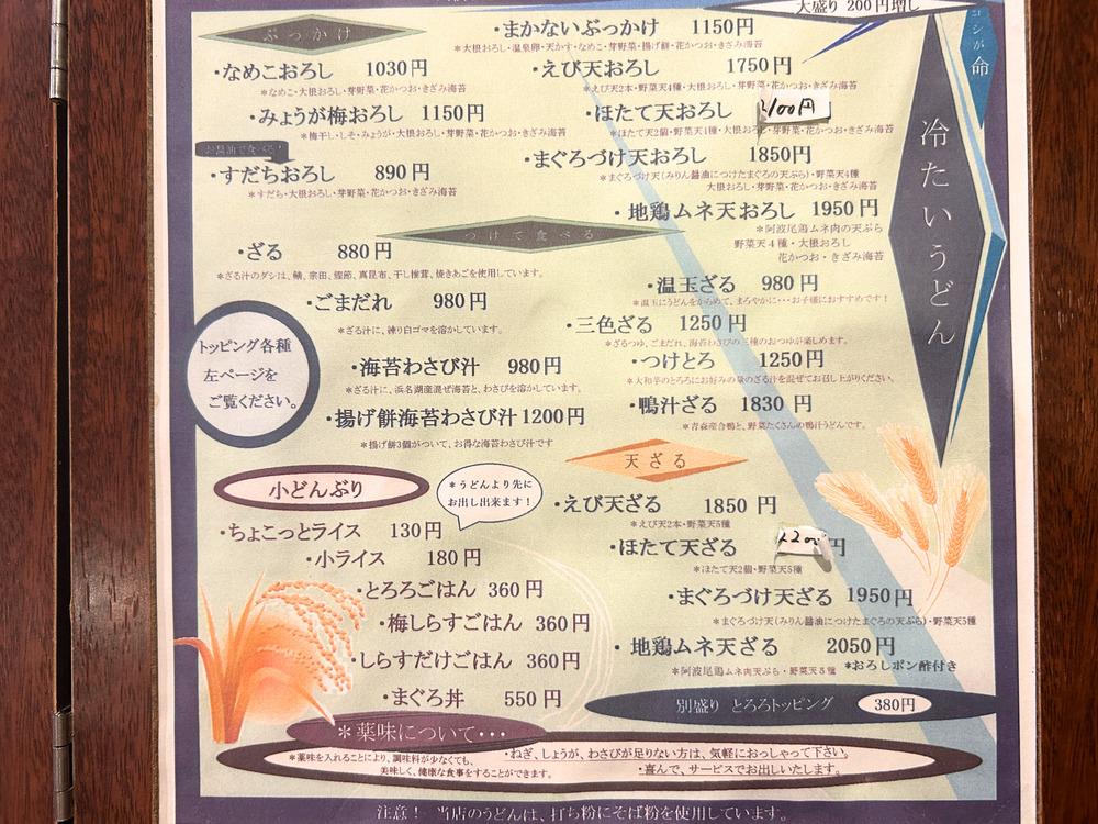 シンプルなかけうどんをはじめ、たまご、天ぷら、釜揚げなどの定番がそろっており、それぞれにいくつかの種類があります。