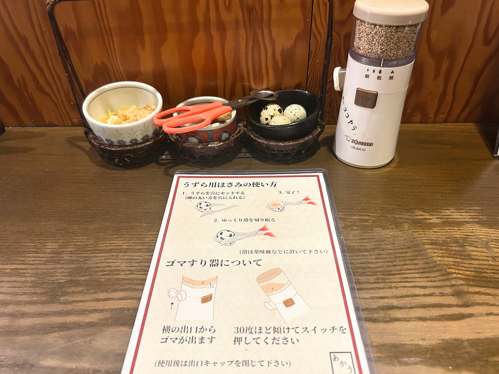 席には自由にいただくことができる天かす、うずらの卵(3個まで)、ゴマが置かれており、うずら用のはさみと使い方の説明書も用意されていました。