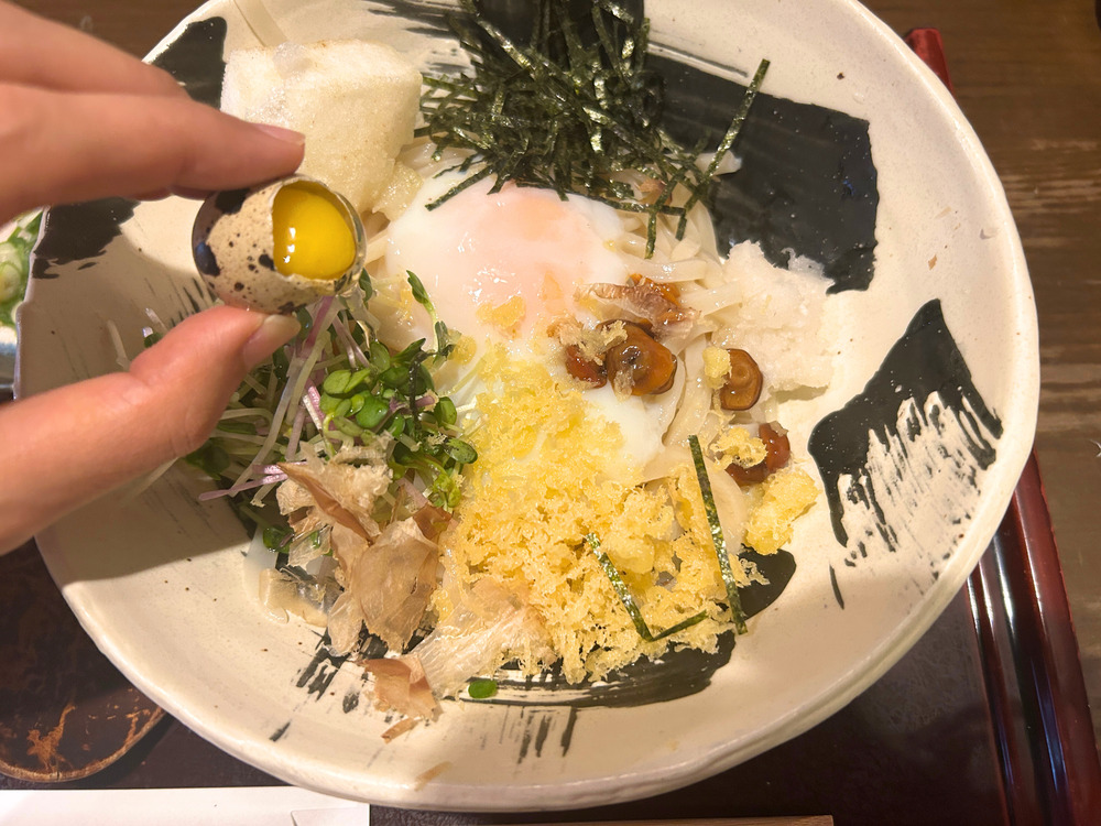 大根おろし、温泉卵、天かす、なめこ、芽野菜、揚げ餅、花かつお、刻み海苔とたくさんの具材がたっぷりのっています。