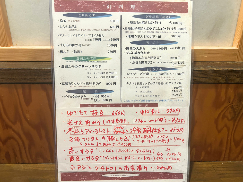 ダチョウのタタキ、レアチーズ豆腐、そしてそれらを使った和風グラタンなどあまり他では見かけないようなものが多くありました。