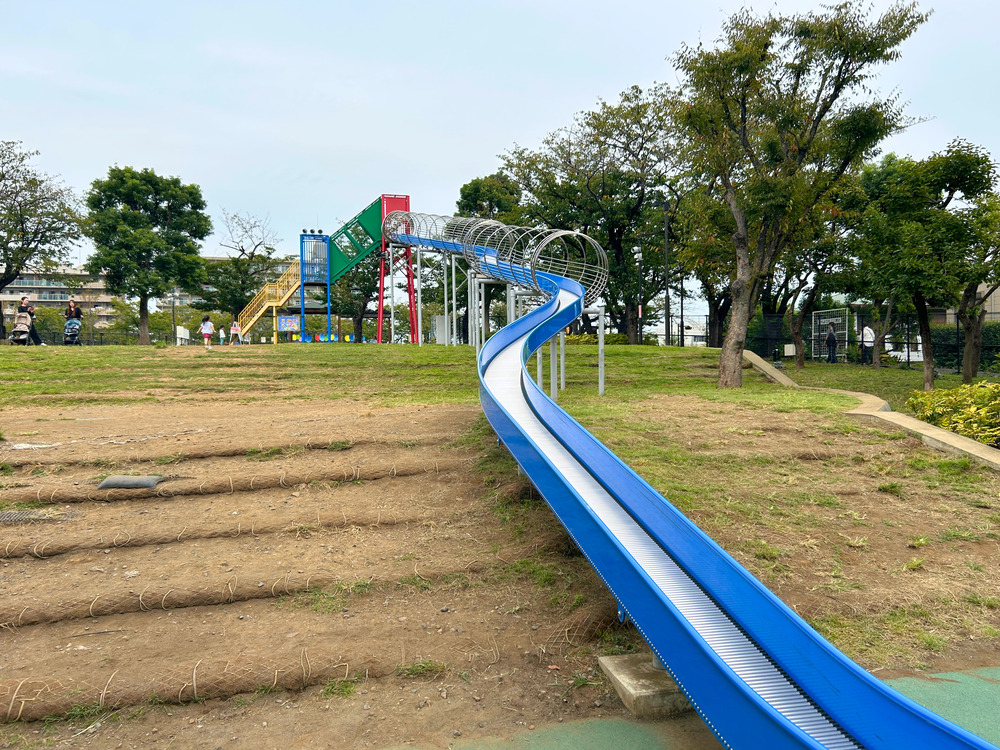 芝生が広がる「しばふ広場」には、ロングすべり台や小さい子でも楽しめる多数のアスレチックもあり、自然の中でのびのび遊べます。