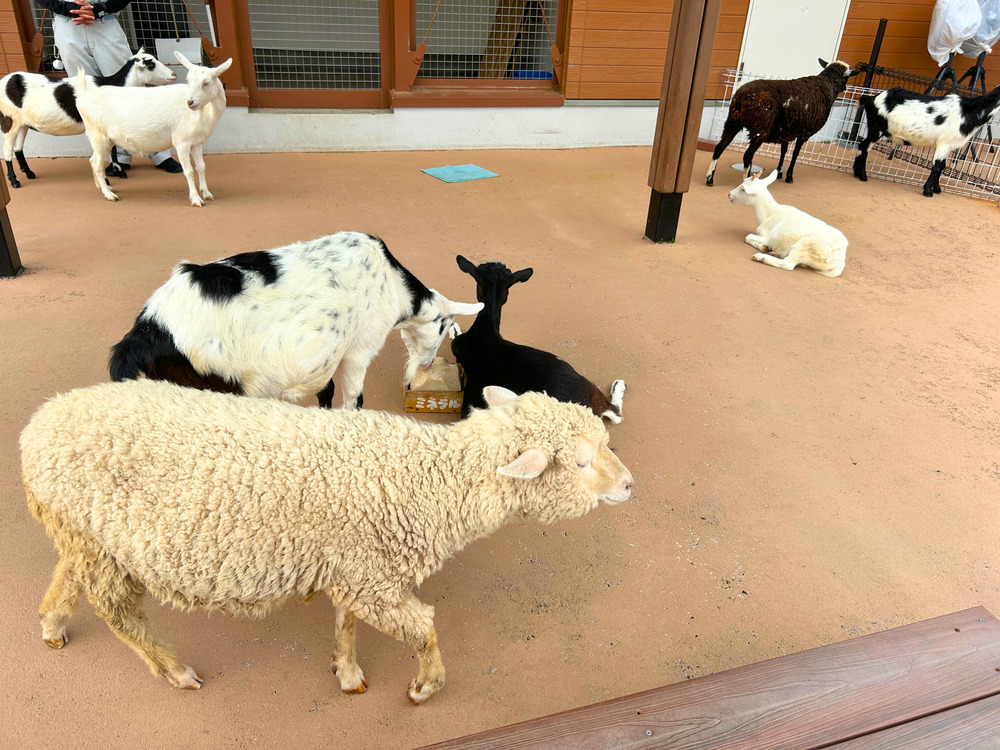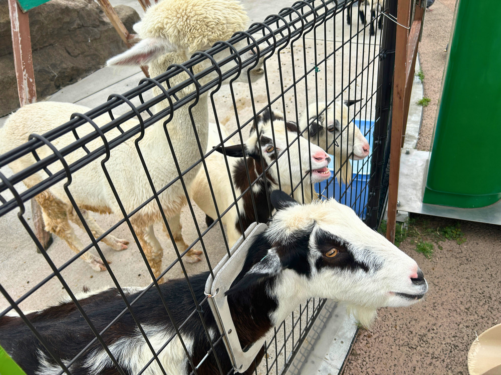 「ぱくぱくヤギひろば」では、ヤギ、アルパカ、ひつじたちに餌やりができます。
