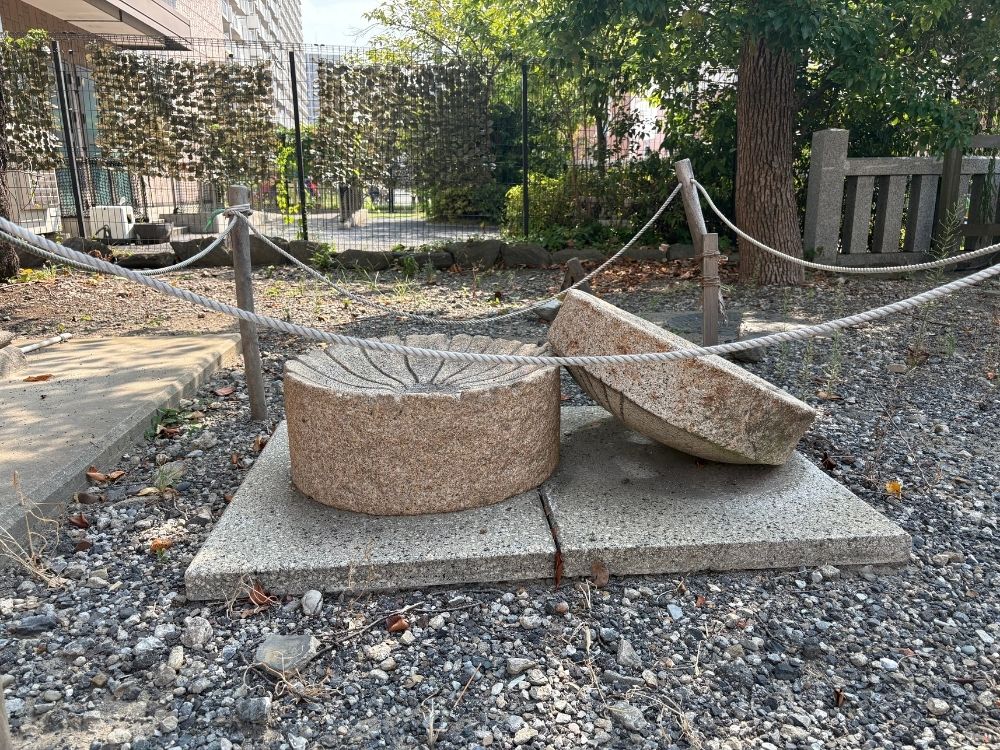 神社名の由来にもなった、かつてこの地で盛んだった産業、胡粉(牡蠣の殻から作る白い顔料)作りに使われた石臼が展示されています。
