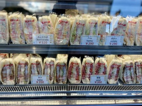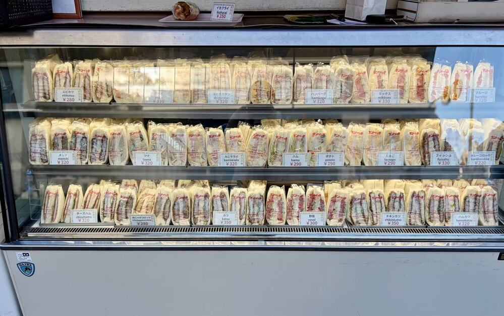 ショーケースには、定番のタマゴやツナ、野菜たっぷりのヘルシーなものから、カツやハンバーグを挟んだガッツリ系、フルーツまで圧巻のボリュームです。