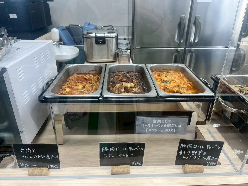来店した日は「豚肉ロールキャベツ シチュー仕立て」と「豚肉ロールキャベツ 彩り野菜のトマトクリーム煮込み」の2種類が並んでいました。